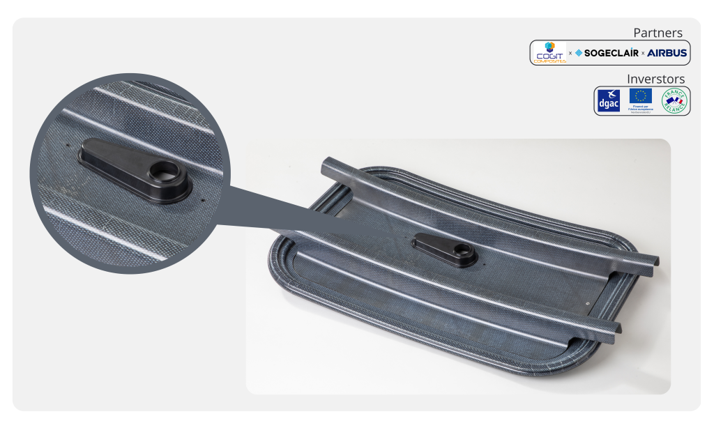 Cette trappe a été estampée par Sogeclair Equipment, expert en Thermoplastique composite, et surmoulée par COGIT Composites. Il s’agit d’une ‘EB door’ typiquement située en dessous du cockpit d’un avion.